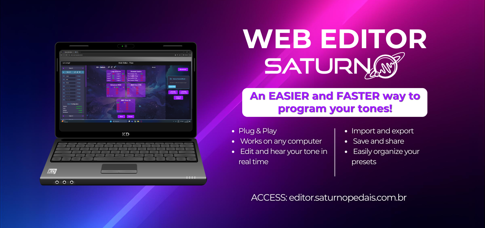 With the new Saturno WebEditor, you can configure everything quickly and easily — right from your browser. Adjust your presets, organize your setlist, and control every pedal on your board exactly how you want — no installation required.
