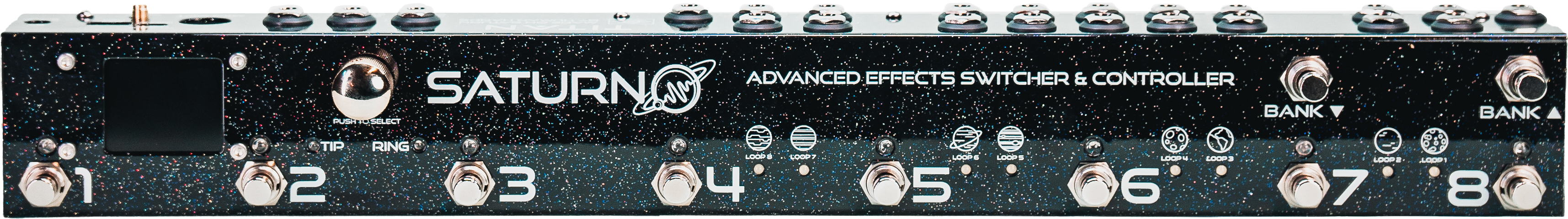 130 Patches | 26 Banks | 5 Footswitches + Bank Up & Bank Down | 4 Effects Loops for Classical Stomps | MIDI Out | USB A Host Connection (Full compatibility, even with equipments without USB MIDI) + USB C Type for firmware update and MIDI Support through PC/Mac/iOS/Android | Expression Pedal Input (Accepts pedal with Toe switch) | 2 Remote Switches Output (Control your AmpChannel, TapTempo, Pedal External Functions, etc) | Wireless Connectivity with Saturn® Equipments | Color Graphic Display